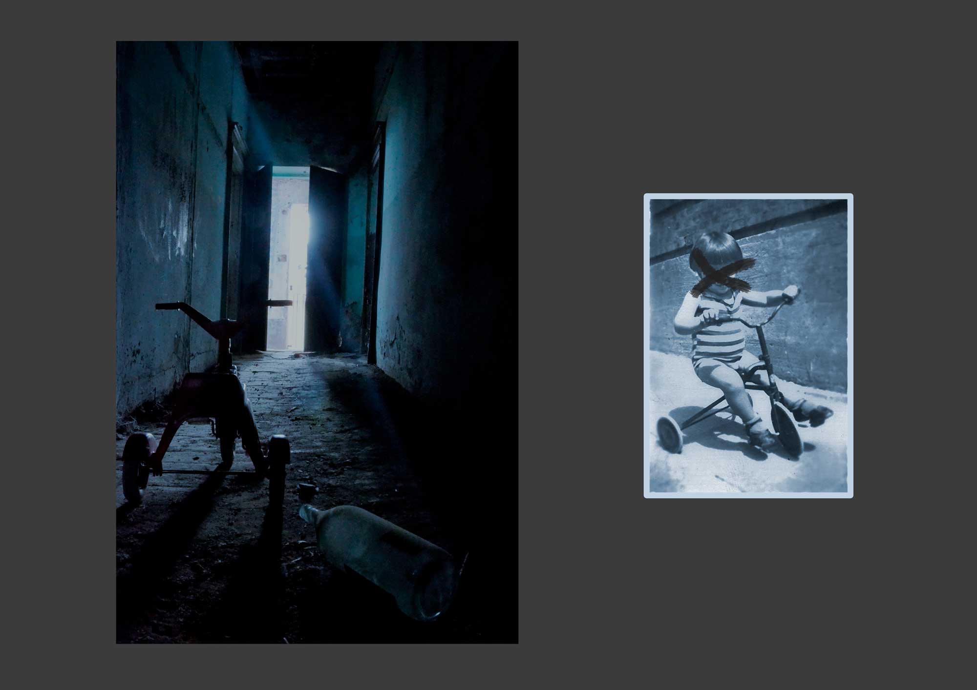 Ogni immagine del portfolio affronta un tema diverso ed è composta da due scatti: una vecchia fotografia avente come soggetto un bambino con il viso cancellato è abbinata ad una mia fotografia che ricorda la stessa situazione.